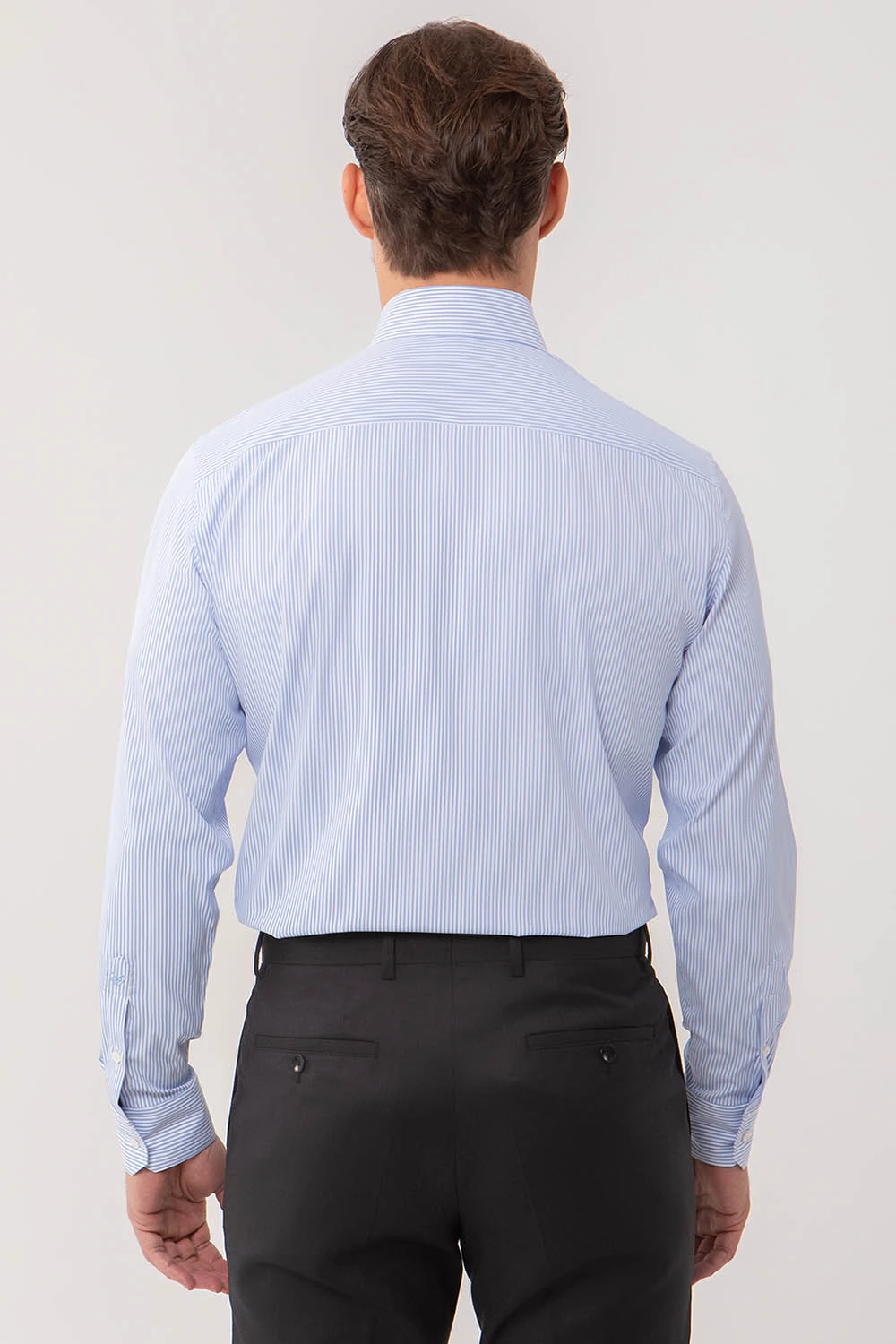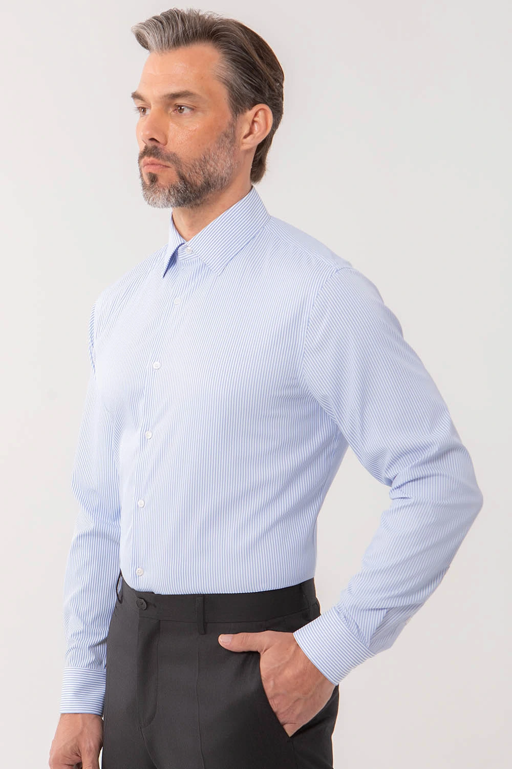 Une chemise rayée bleu ciel à l’allure dynamique et moderne. Son tissu technique respirant et extensible assure liberté de mouvement, tenue impeccable et confort pour les journées actives.